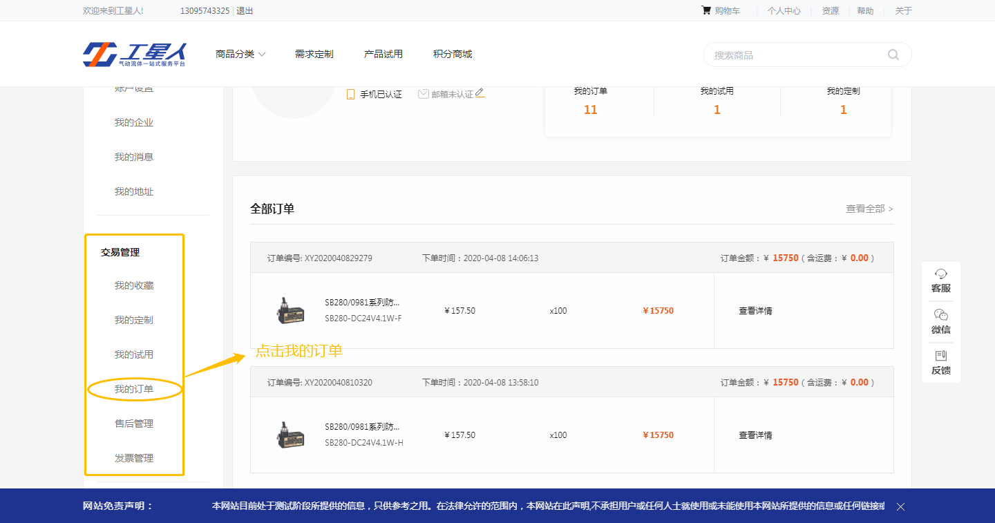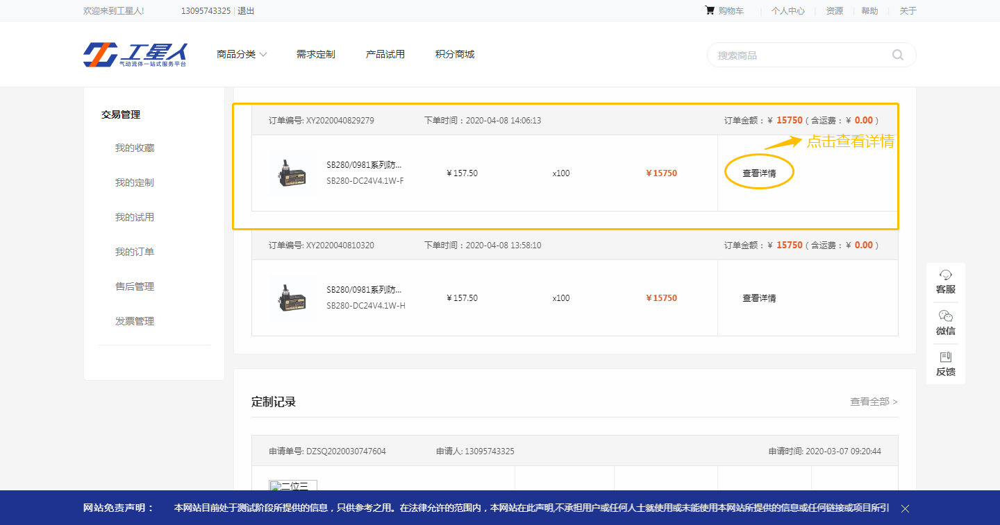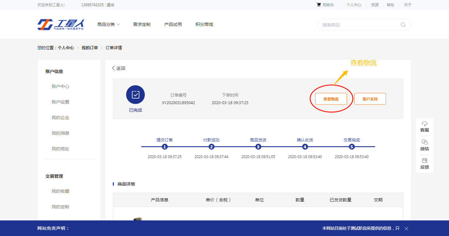 账户中心-交易管理-我的订单-找到对应产品-点击查看详情-查看物流